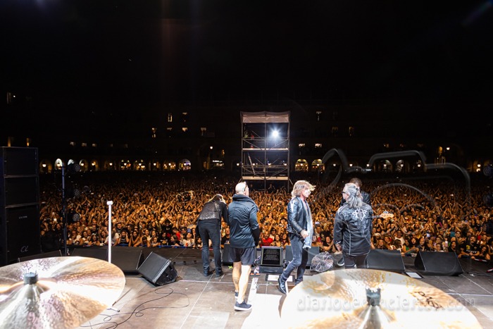 El repertorio no dejó lugar a la calma. Europe abrió con “On Broken Wings” y “Rock the Night”, dos descargas que pusieron en pie a un público entregado desde el primer minuto. El clímax emocional llegó con “Carrie”, cuando Tempest cedió el micrófono y la Plaza Mayor se convirtió en un gigantesco coro iluminado por miles de móviles.