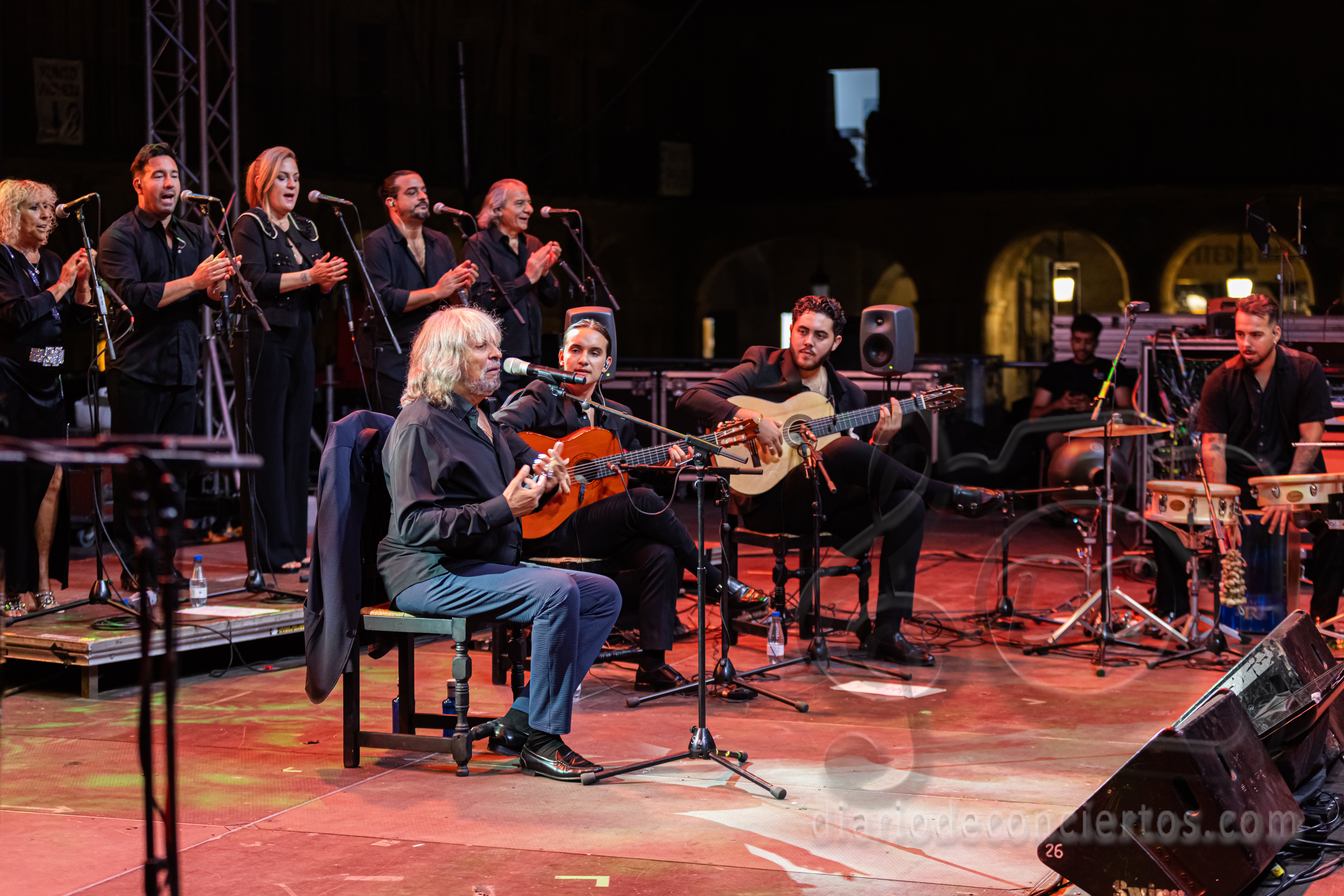 Arropado por su cuadro flamenco habitual —guitarras, palmas, percusión— y con el refuerzo de piano y contrabajo, Mercé construyó un espectáculo en el que la intimidad y la fuerza convivieron con naturalidad. Uno de los instantes más sobrecogedores llegó con su cante a capella, que llenó de silencio reverente la plaza antes de estallar en una ovación cerrada.