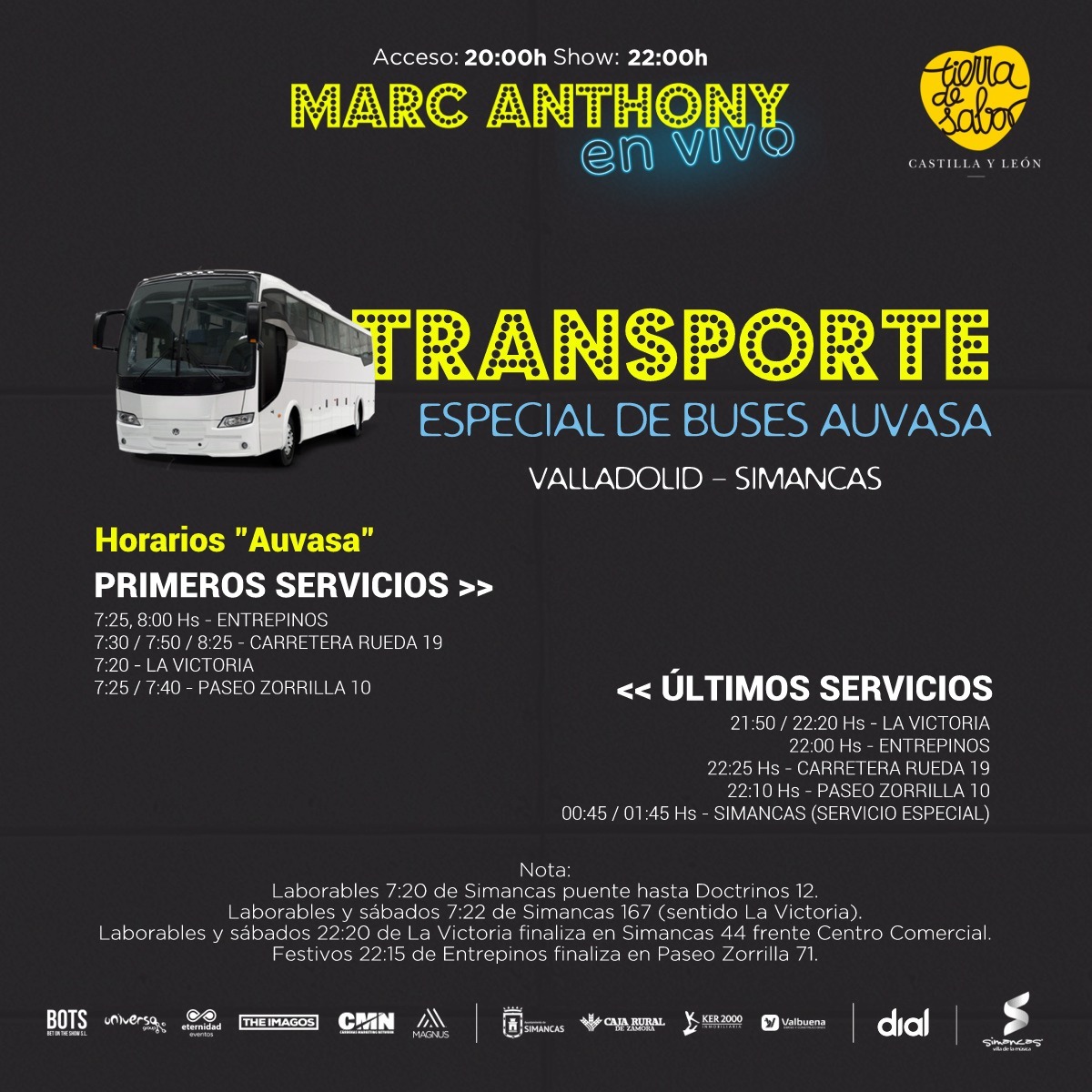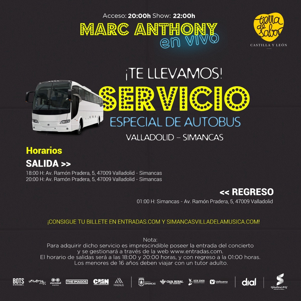 Está habilitado un servicio de Autobuses entre Valladolid y la localidad de Simancas. Para adquirir dicho servicio es imprescindible poseer la entrada del concierto y se gestionará a través de la web www.entradas.com (https://www.entradas.com/artist/marc-anthony/marc-anthony-en-vivo-3838659/?affiliate=ADE). El horario de salidas será a las 18:00 y 20:00 horas, con regreso a la 01:00, directamente al punto de partida. Los menores de 16 años deben viajar con un tutor adulto.