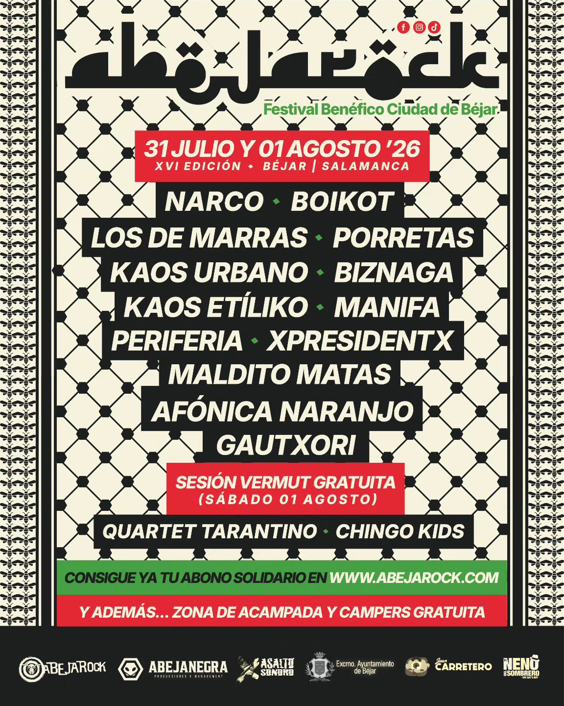 El festival benéfico AbejaRock 2026 anuncia el cartel completo de su XVI edición en Béjar (Salamanca), con Narco, Boikot, Los de Marras, Porretas, Kaos Urbano, Biznaga y más bandas del panorama punk y rock estatal. El evento se celebrará los días 31 de julio y 1 de agosto con abono único de dos días y sesión vermú gratuita.