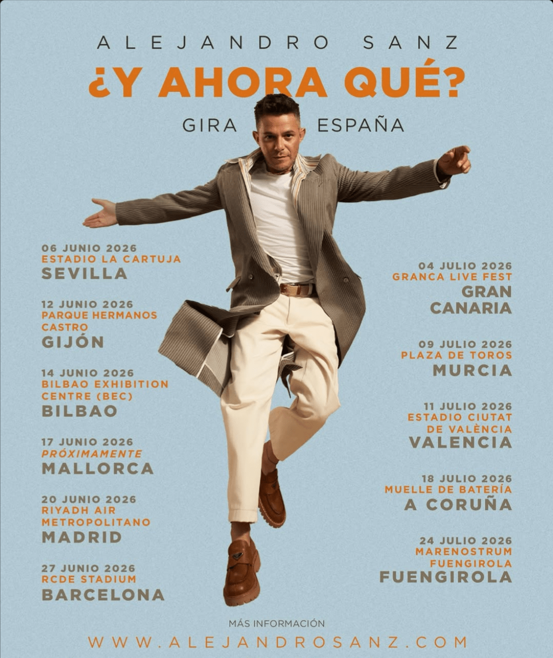 La gira llegará a España dentro de grandes recintos por todo el país a mediados de 2026. Tendremos oportunidad de ver de nuevo a Alejando Sanz en Barcelona de la mano de Doctor Music. La cita será el sábado 27 de junio de 2026 en el RCDE Stadium de Cornellà, Barcelona.