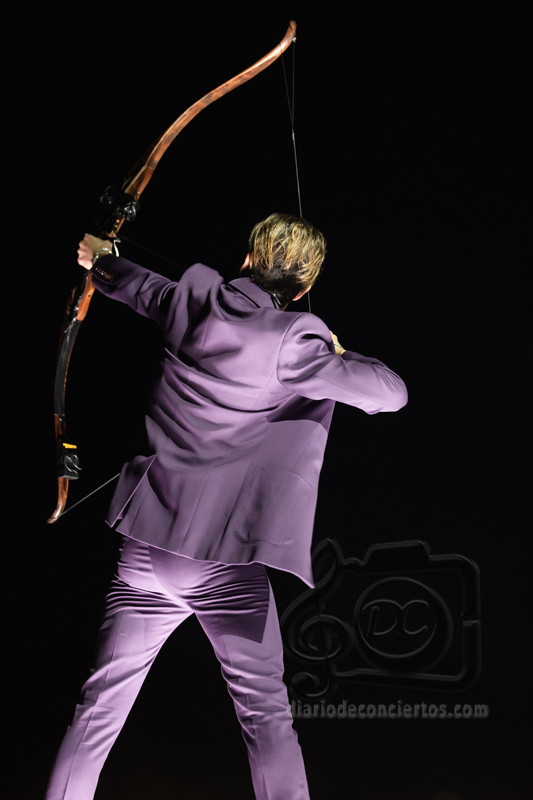 La espera valía la pena y a las 22:30 horas se encendieron los focos blancos y azules que indicaban el comienzo del espectáculo. Manuel Carrasco llegó a su altar, enfundado en una chaqueta negra con flecos en las mangas, y armado con un arco. Los primeros fuegos artificiales sonaron a la par que Corazón y flecha, canción con la que arrancaba el concierto. El cantante recorre una larga pasarela y se consagra con sus fieles, que no dudan en corear, bailar y cantar para celebrar la fiesta que acaba de comenzar.