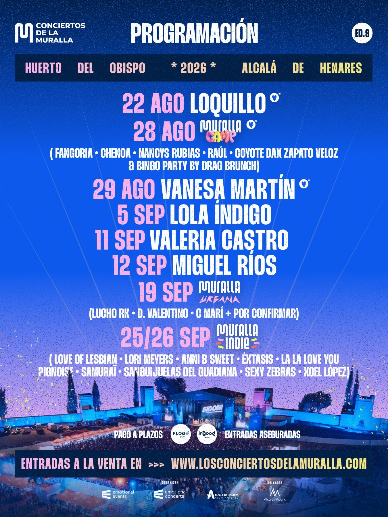 Entradas a la venta: Ya puedes adquirir tus localidades a través de la web oficial www.losconciertosdelamuralla.com. Se recomienda la compra anticipada, especialmente para los abonos del Muralla Indie y el concierto de Lola Índigo, debido a la alta demanda prevista.